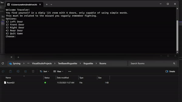 Next, the filing system. I took inspiration from Minecraft based on their chunk loading system using the coordinates of the room to be able to easily return based on where you are. So far this has worked well enough, but I will need to change what information is stored within these files, partially as the game evolves and partially as I change how the room to room movement functions. Overall this has been an amazing learning experience, however!