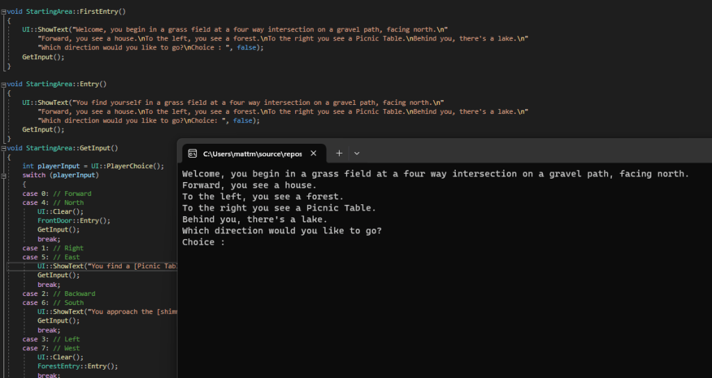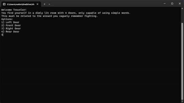 That reminded me of the text-based game most people know, called Zork, which was also re-created within Call of Duty: Black Ops. I figured it would be good for coding practice, so I started typing. First getting the player name and introducing them to the world, and then giving them a moment before throwing them in, by using the enter key to officially start playing.
