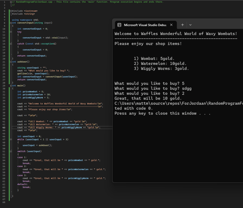 My cousin asked me for some quick sample code for a marketing assignment he had, and my first thought was simply, “What could I build quickly that is fully functional?” I remembered making a shop in an optional challenge in Programming 1 and decided to rebuild a quick easy version of that shop for him with a fun name because it sounded silly! Now, I’ll be the first to admit there are issues in this code. However, I made it in like 15 minutes, and I had to keep it all in a single class with a couple methods so I could easily take a screenshot of the entirety of the code, as opposed to multiple screenshots.