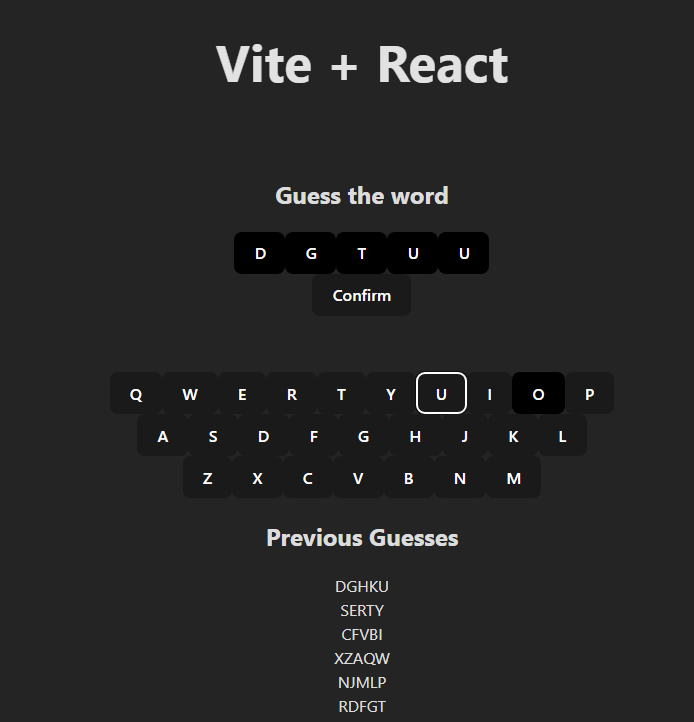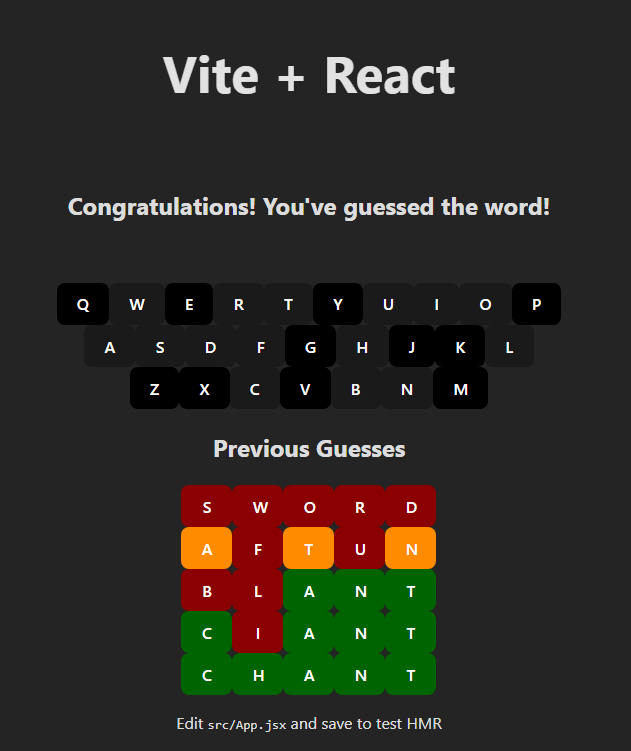 And with that, Wordle was completed! Now, there were obviously smaller pieces, harder to notice. This included the seemingly obvious piece, that still needed to be programmed. Once the player has chosen 5 letters, clicking a 6th letter should do nothing. However, in my version it was still changing the last letter instead. A simple change, adding a check at that point. Naturally, I had to do it, otherwise the game would not be complete.